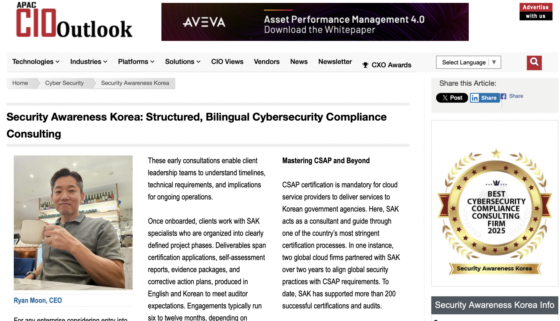 Security Awareness Korea, Inc. (CEO Ryan Moon), a specialized information security compliance consulting firm, has been awarded as the Best Cybersecurity Compliance Consulting Firm 2025 by APAC CIO Outlook magazine. The magazine's website features the announcement and an interview with CEO Moon.